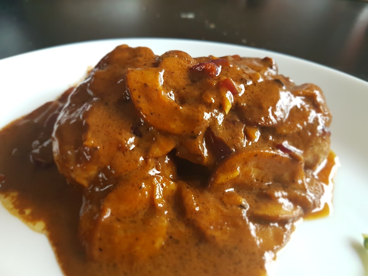 Marinade, kookroom, tomatenketchup, (kastanje) champignons, (rode) ui.